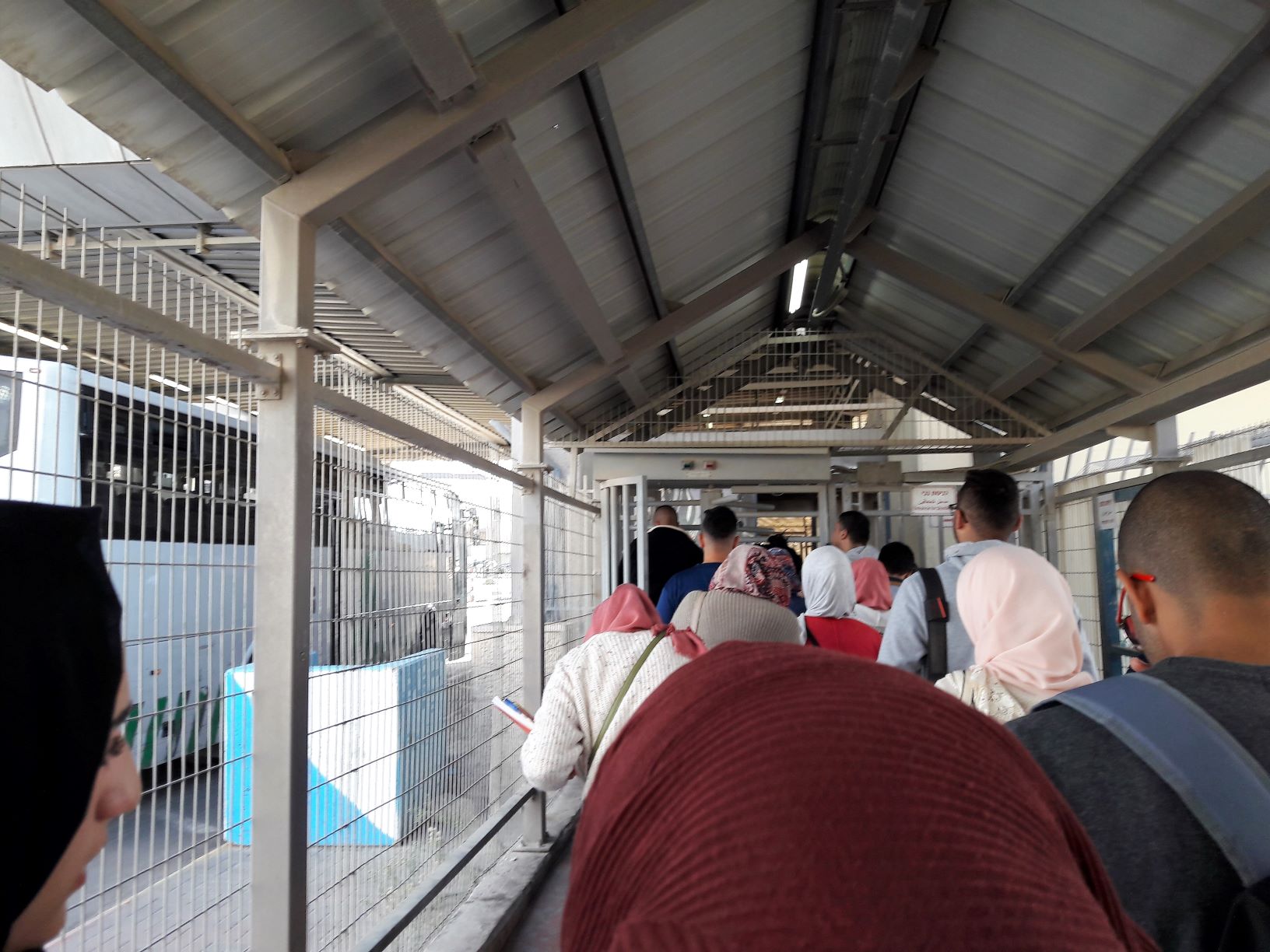Upon reaching Qalandiya Checkpoint everyone got off the bus. We had to queue in a corrugated-roofed tunnel with metal fenced sides. We then had to go through a metal turnstile one-by-one when the lights above us went from red to green.