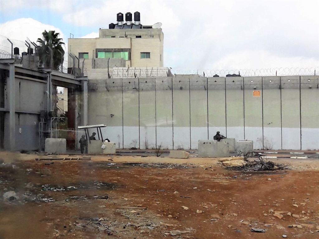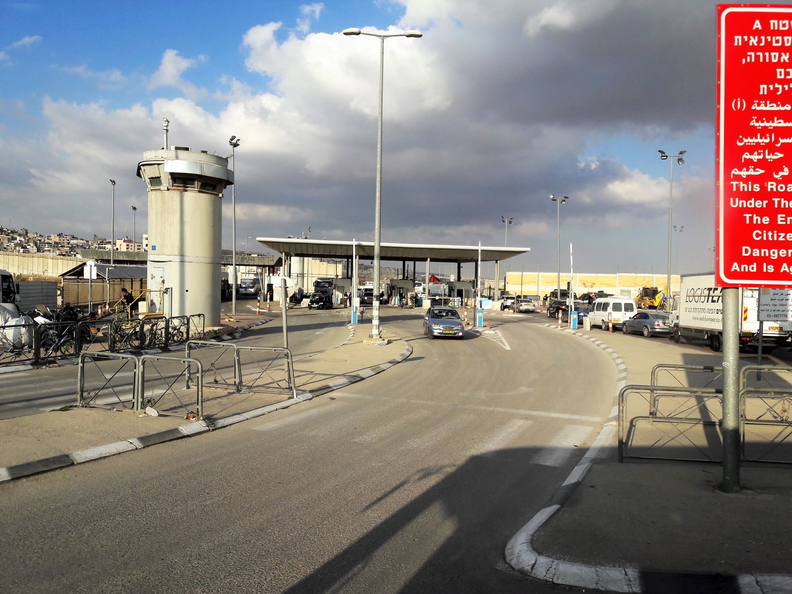 A large red sign indicating that Israeli citizens were no longer permitted beyond the point was now in front of us. Foot passengers were crossing on the far right-hand side while the bus pulled into the side lane which was now bumper to bumper with traffic.