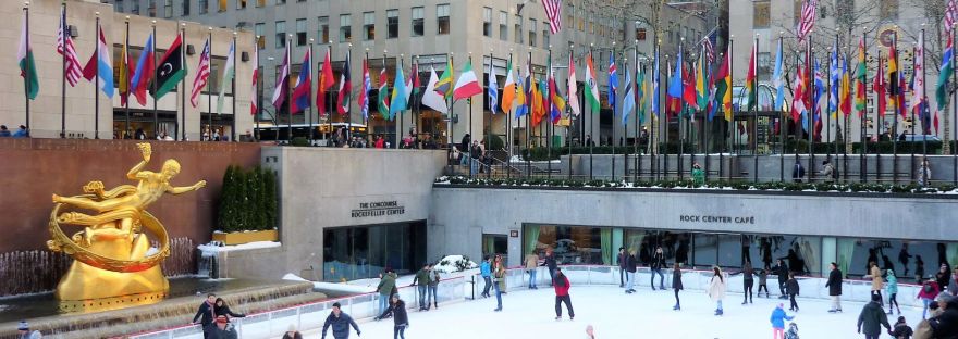 The Rockefeller Center is a complex of multi-purpose buildings dating back to the 1930s. The centre is located between Fifth and Sixth Avenues between 48th and 51st Streets. The original buildings are in an Art Deco style.