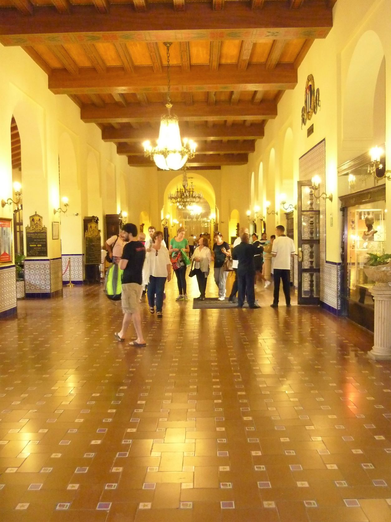 The interior is Spanish-style with the exterior looking neoclassical French. The hotel doubles as a meeting point with mahogany chairs and tables filled with casual drinkers. The building oozes character, evocative of a decadent past. Live music and dancing takes place in the colonnaded area at the front to both hotel patrons and to local commuters waiting at the nearby bus stop.