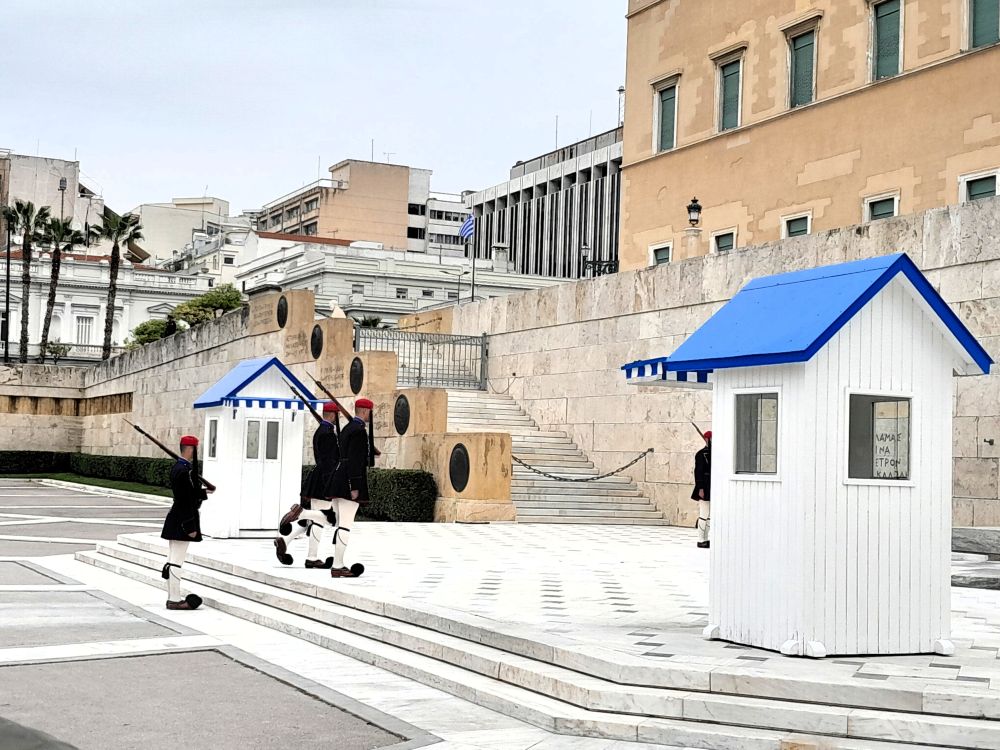 From the Panathenaic Stadium, walk through the National Gardens to Syntagma Square, the heart of Athens. The Tomb of the Unknown Soldier lies outside the Parliament building and is guarded 24 hours a day by soldiers called Evzones. The Changing the Guard ceremony takes place every hour. The Evzones have a unique uniform, the most striking feature being the tassels on the shoes.