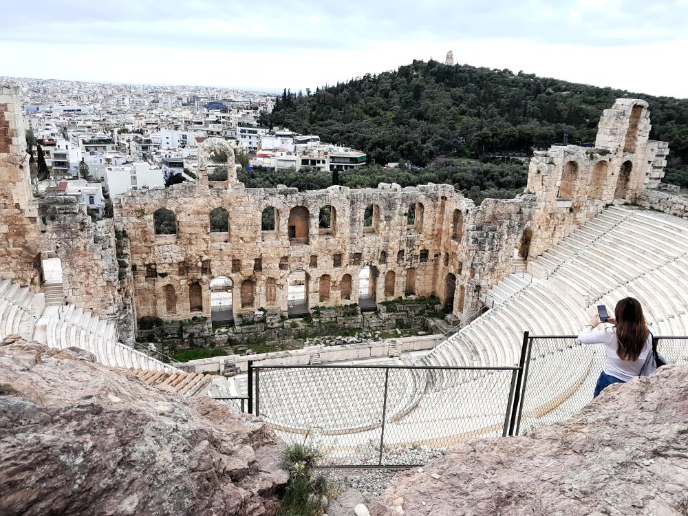 Visitors enter the top part of the Acropolis via the Propylaia, while the wheelchair access point enters near the Erechtheion. Other buildings in the Acropolis area that are worth looking at are the Odeon of Herodes Atticus, a Roman Empire construct still used for events, and the Theatre of Dionysos, site of the world’s first theatre in the 6th Century BC. The current theatre dates back to 300-400 BC.